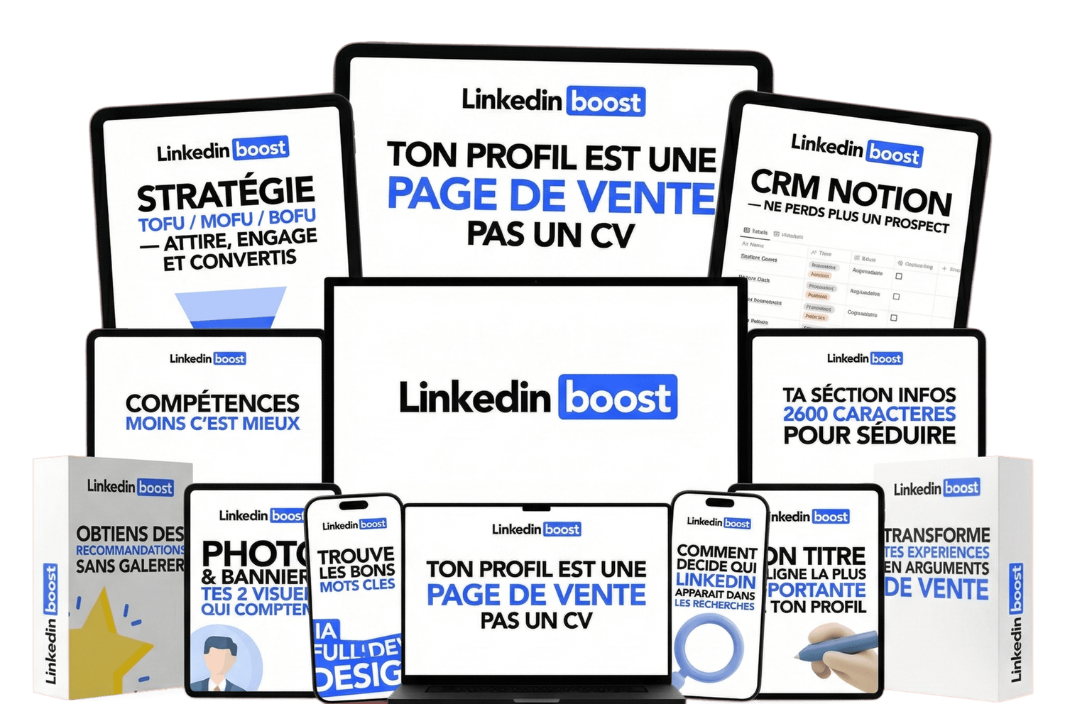 LinkedIn Boost te donne la méthode exacte qui m'a permis de passer de 0 à 12 500 abonnés en 2 ans. Les prompts spécifiques, les templates, la stratégie TOFU/MOFU/BOFU, le CRM, les calls en direct, et surtout un groupe qui te pousse à agir.